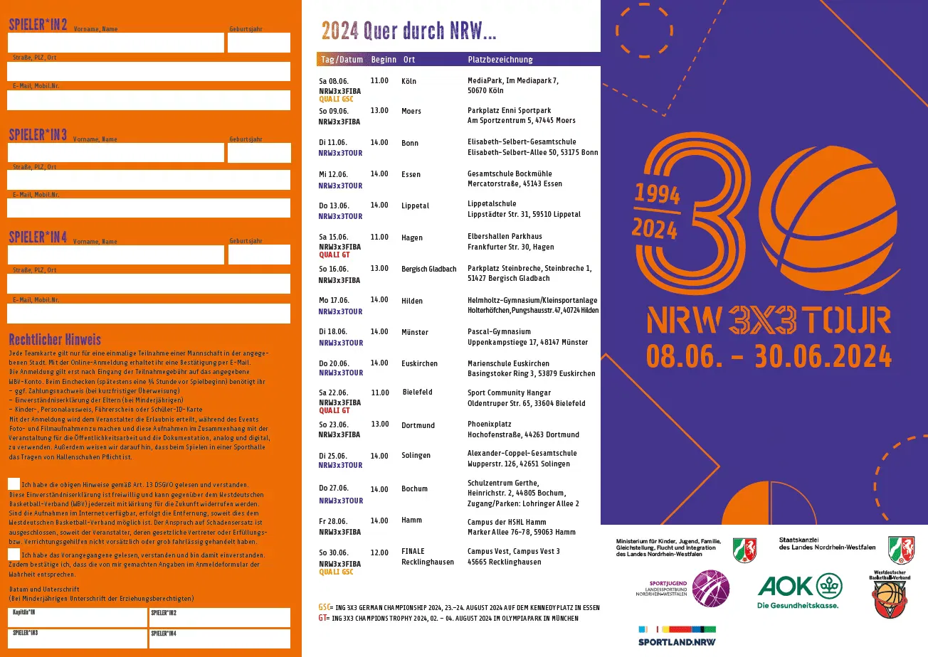 Die aktuellen Flyer und Plakate der NRW3x3Tour 2024 sind im Umlauf! Solltet ihr Flyer und Plakate benötigen (z.B. für eure Schule), meldet euch unter info@nrw-tour.de!